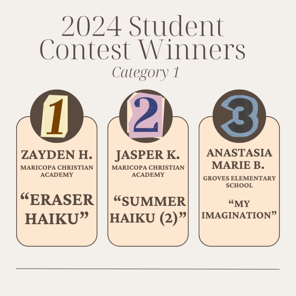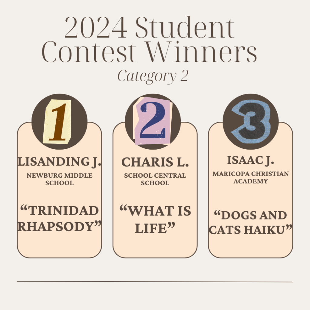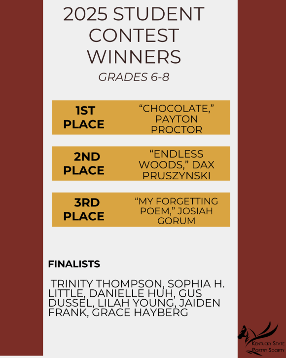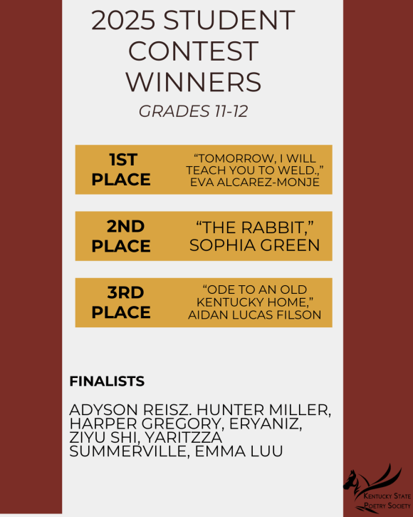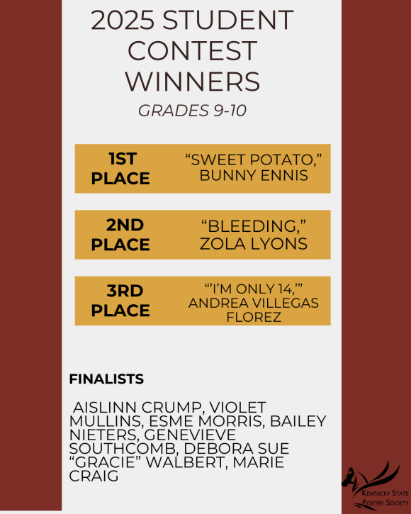 We have one contest that students, grades 3-12, are eligible for. Winners are invited to share their poems at the Annual KSPS Conference in October. First-place winners will have their work published in Pegasus, the Literary Journal of the Kentucky State Poetry Society.
