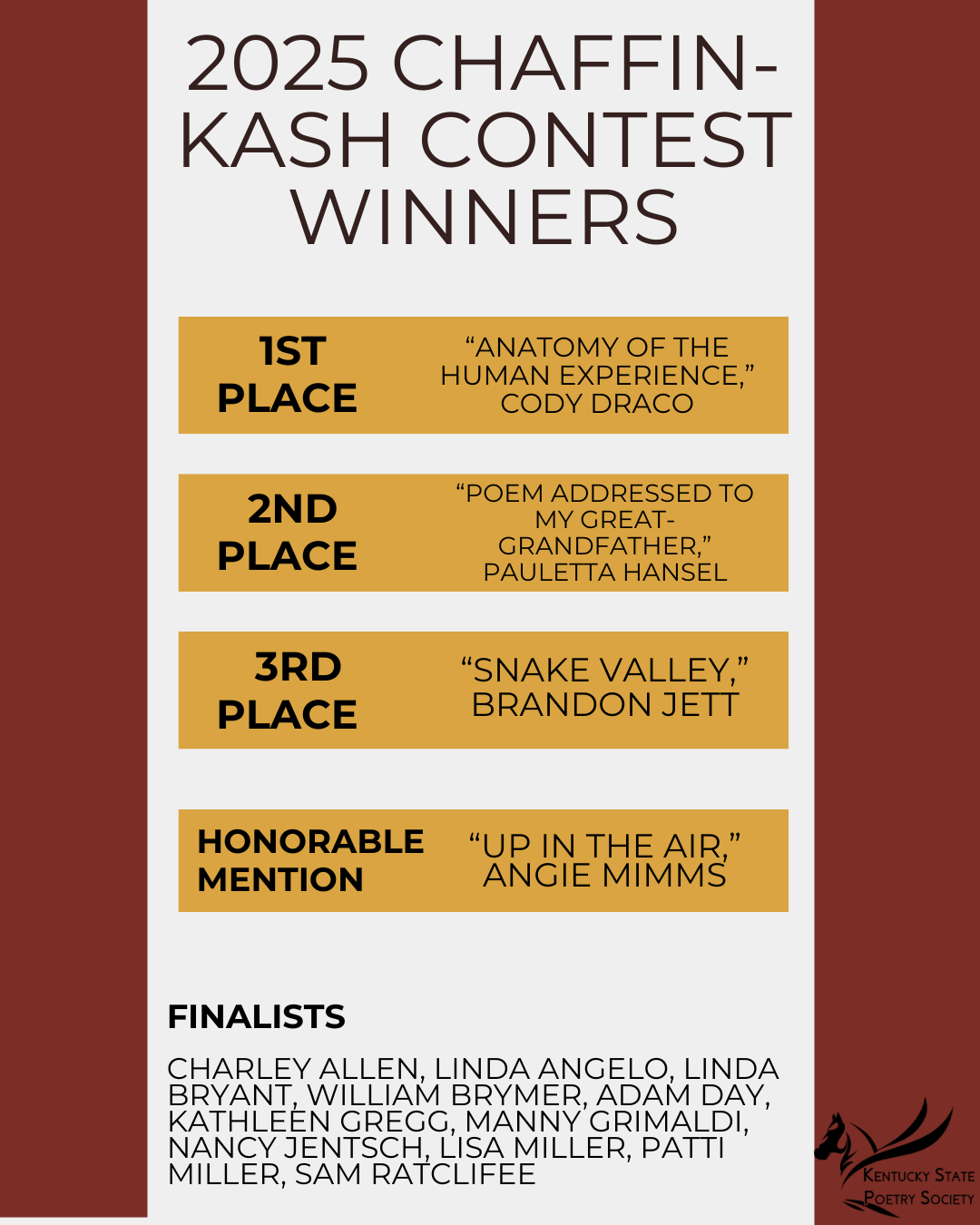 - The KSPS Chaffin/Kash Contest is open only to members of the Kentucky State Poetry Society (see KSPS website for membership information)