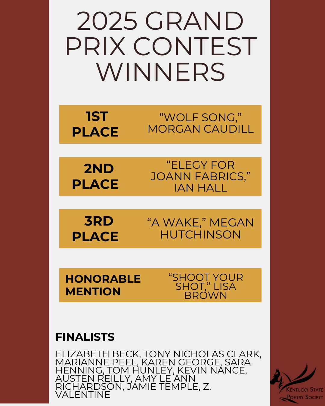 - Winners are announced in September and are invited to read at the KSPS annual conference